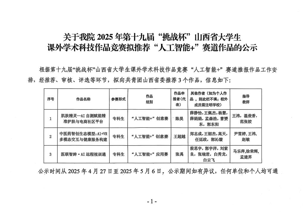 关于我院2025年第十九届“挑战杯”山西省大学生课外学术科技作品竞赛拟推荐“人工智能 ”赛道作品的公示-ks8凯发官方网站