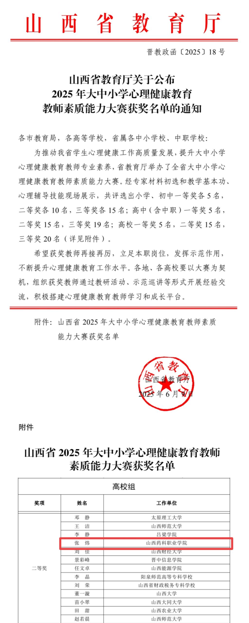 近日,山西省大中小学心理健康教育教师素质能力大赛决赛在山西大学落幕。我院心理健康教育教师张炜荣获二等奖。