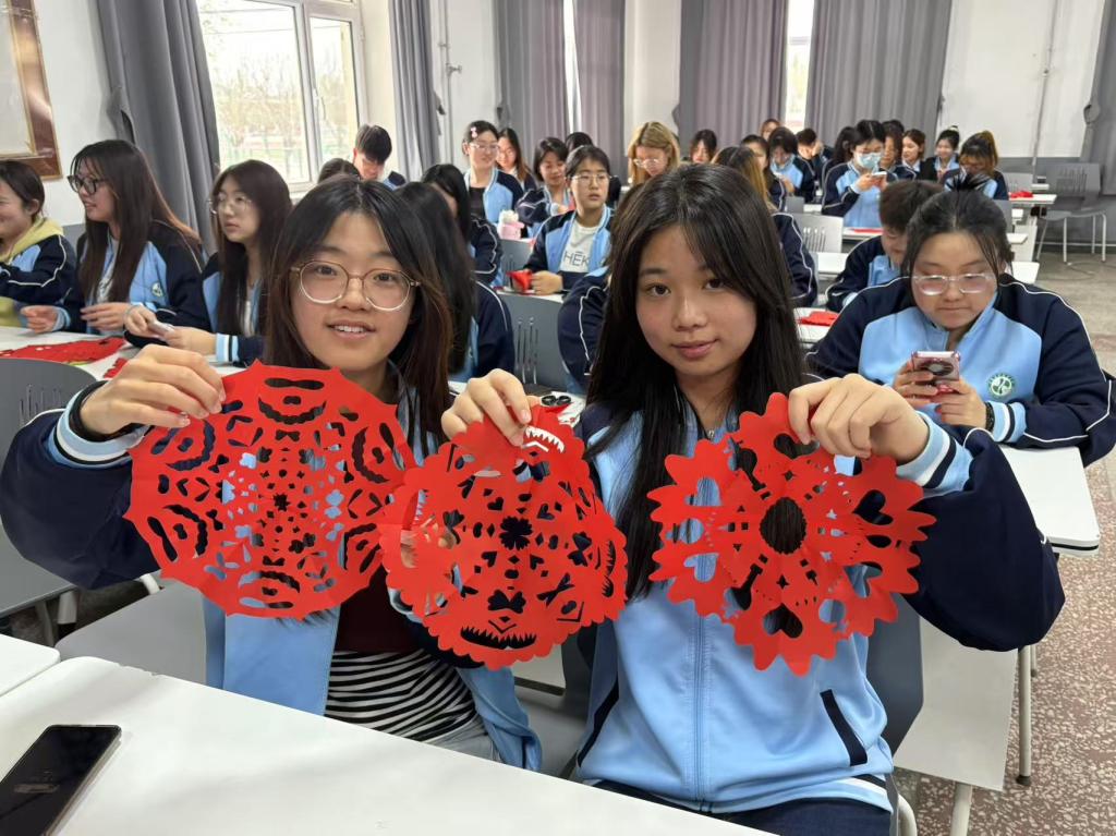 随后,在毛宏玉老师的指导下,师生们亲自动手体验剪纸的艺术和乐趣,从折纸到构思,再到小心翼翼的裁剪,每一个步骤都充满了挑战与惊喜,每一次裁剪都展现着个人的审美,一张普通的宣纸经过学生们别出心裁的裁剪,变成了自己满意的艺术品,师生们脸上洋溢着自信自豪的表情。