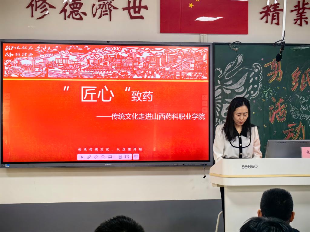 剪纸非遗传承人毛宏玉老师围绕“匠心致药—传统文化走进山西药科职业学院”为主题,从北京冬奥运的中式元素讲起,详细的介绍了“剪纸”的历史渊源、艺术特色、制作技巧和主要用途。全体师生聚精会神地聆听,充满了对这一传统艺术的好奇和热爱,对学生的问题,毛宏玉老师耐心解答,现场气氛十分活跃。