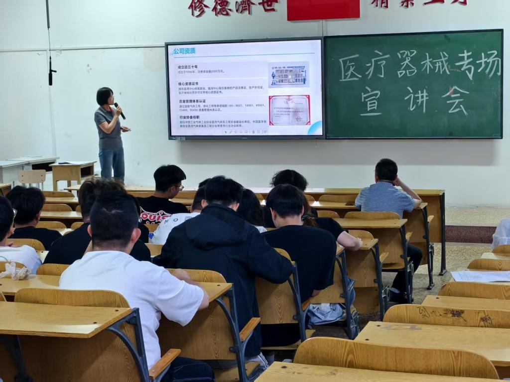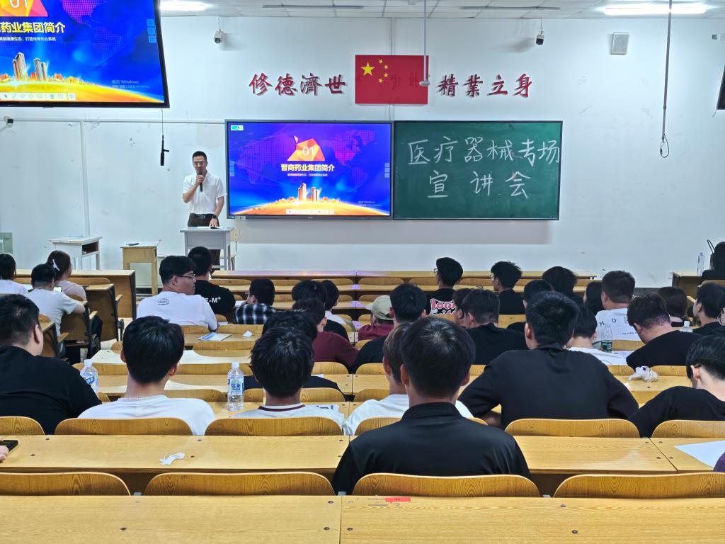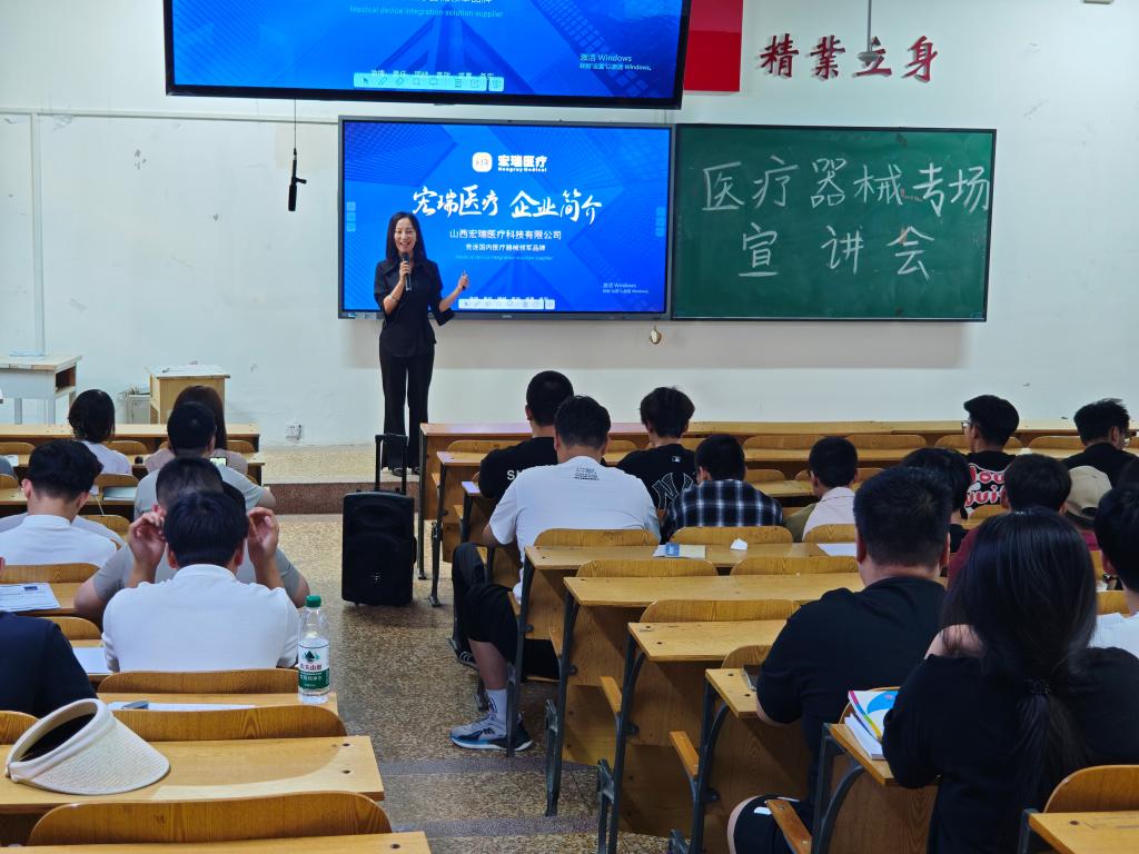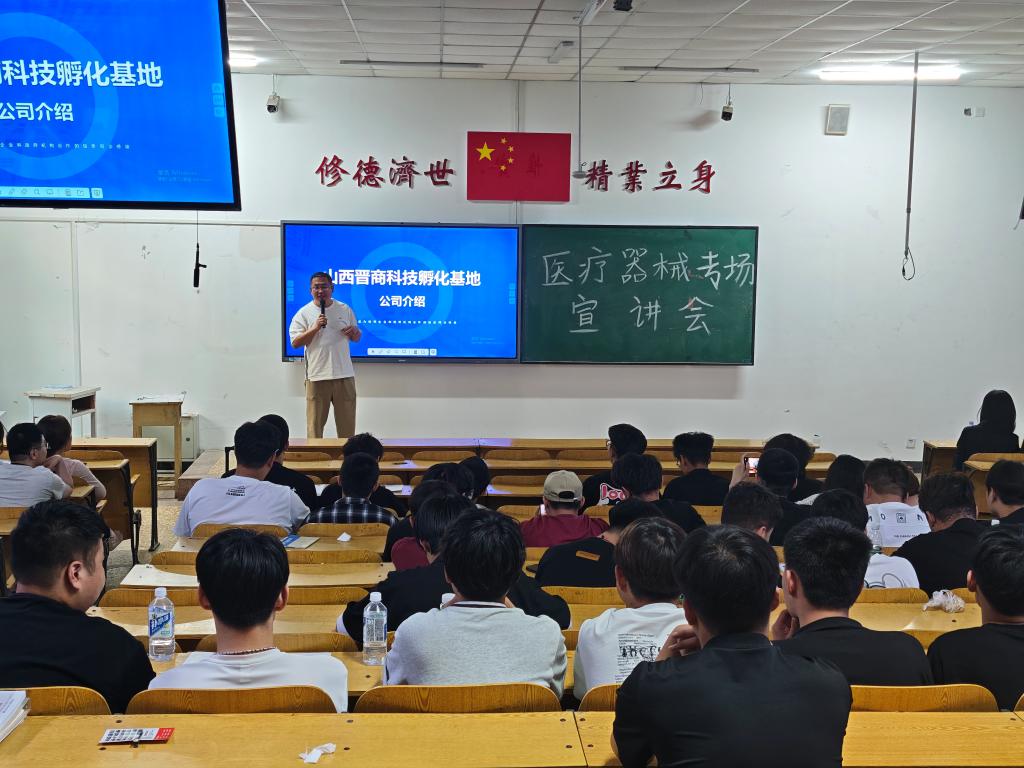 宣讲会上,各企业结合自身核心业务,精准推介特色岗位。山西易莱康医疗科技股份有限公司围绕跟台人员与销售助理岗位展开,详细介绍岗位需配合医疗设备手术现场支持、客户沟通及市场推广等工作内容,分享岗位成长路径与行业资源优势;太原市欣易得医疗设备有限公司聚焦医气工程师岗位,通过实际案例解读该岗位在医院气体系统设计、安装与维护中的重要职责,强调对专业技术与实践能力的要求;山西晋商药业集团立足医药行业需求,旗下的山西晋商科技孵化基地依托集团在医药大健康领域的资源积累,充分发挥自身在园区运营、行业整合及政策对接方面的优势,聚焦医疗器械产业链企业发展需求,通过搭建专业化服务平台,助力相关企业创新升级、延伸产业链条并提升核心竞争力,推动医疗器械产业集聚与高质量发展;山西宏瑞医疗科技有限公司别出心裁,不仅介绍售后工程师岗位工作内容,还通过视频展示工厂环境,让同学们直观感受生产一线场景,凸显企业设备维护与技术服务实力;山西华晋康商贸有限公司则结合医疗器械贸易业务,开放售后工程师等岗位,剖析行业市场动态与岗位职业发展规划。