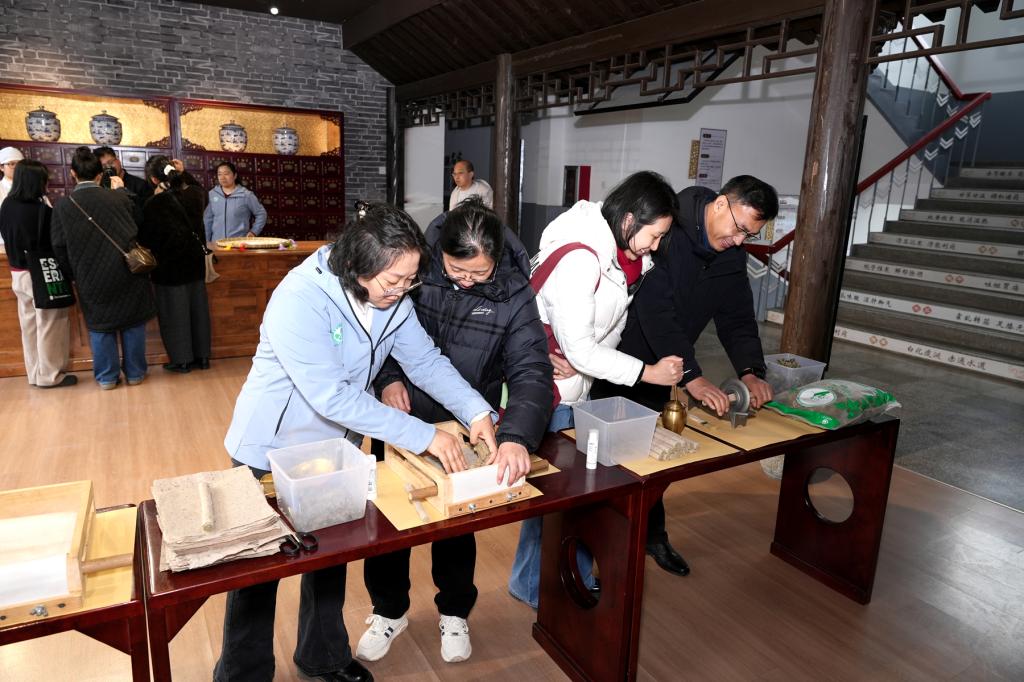 活动以“匠心传承 创新体验”为主线,精心构建了多维互动场景:专业教师引领职工依次参观中药调剂技艺传承基地、中药标本馆、百草大药房、药·茶技能技艺传承与创新实基地,并一同欣赏非遗作品布贴画等,感受中医药文化的深厚底蕴与多元魅力;在diy工坊,参与者巧妙地将道地药材融入手工皂基,精心制作出既具养生功效又富有艺术价值的本草香皂,同时还亲手制作了功能各异的香包;ai肤质检测仪结合中医体质辨识理论,为参与者量身定制个性化护肤方案,彰显中医药护肤的独特理念;在艾条制作环节,职工们亲手将艾绒卷制成条,亲身体验“医草之王”艾草从田间生长到成为疗愈工具的神奇转变过程。